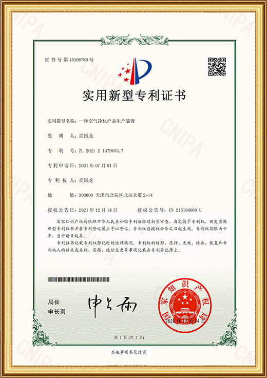 實用新型專利證書(一種空氣凈化產(chǎn)品生產(chǎn)裝置